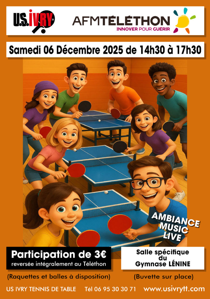US Ivry Tennis de table – Téléthon 26 novembre 202526 novembre 2025Ahcene Fares Venez nombreux participer à la récolte de fonds organisée par l’US Ivry Tennis de table en faveur du Téléthon.